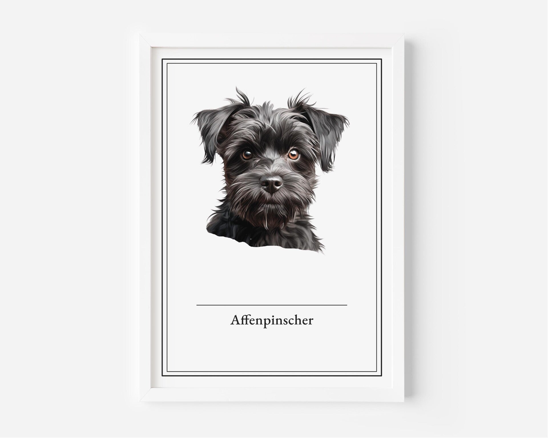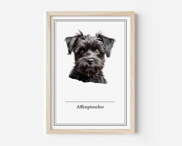 Ontdek de Affenpinscher poster in A5, A4, 30x40 op 350 gram papier, en A2 op 250 gram papier. Een perfecte weergave van de charmante en speelse Affenpinscher. Ideaal voor hondenliefhebbers die een unieke en stijlvolle toevoeging aan hun interieur willen. Nog mooier met een zwarte, witte of houten lijst eromheen!