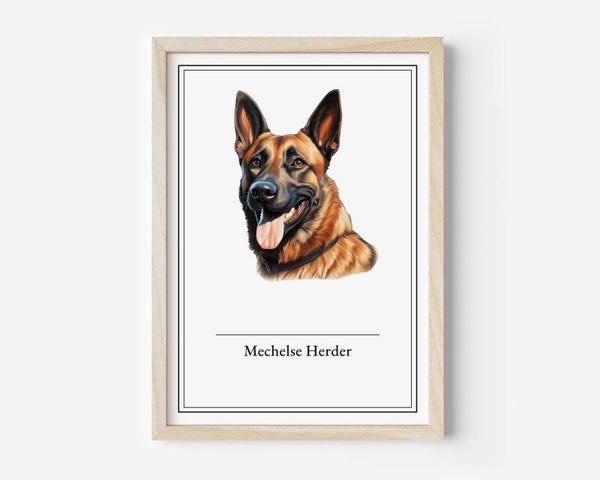 Ontdek de majestueuze schoonheid van de Mechelse Herder, een hond die zowel waakzaam als intelligent is. Deze poster vangt zijn kracht en loyaliteit in elk detail. Verkrijgbaar in A5, A4, 30x40 en A2 formaten, gedrukt op luxe 350 grams papier. Voeg een verfijnde lijst in zwart, wit of hout toe voor een tijdloze uitstraling.
