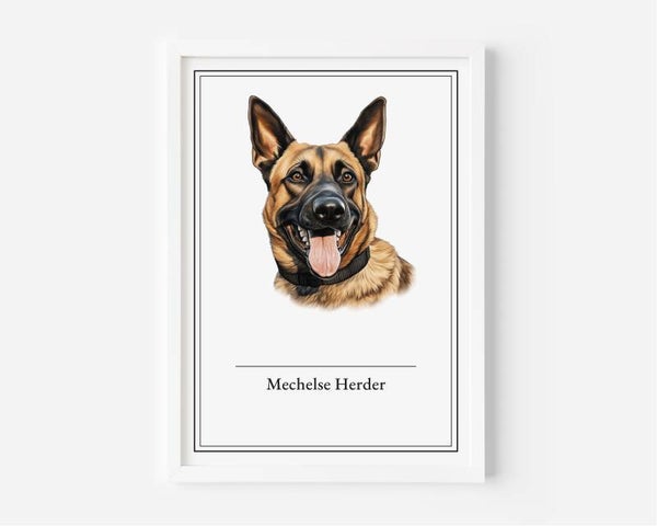 Ontdek de majestueuze schoonheid van de Mechelse Herder, een hond die zowel waakzaam als intelligent is. Deze poster vangt zijn kracht en loyaliteit in elk detail. Verkrijgbaar in A5, A4, 30x40 en A2 formaten, gedrukt op luxe 350 grams papier. Voeg een verfijnde lijst in zwart, wit of hout toe voor een tijdloze uitstraling.