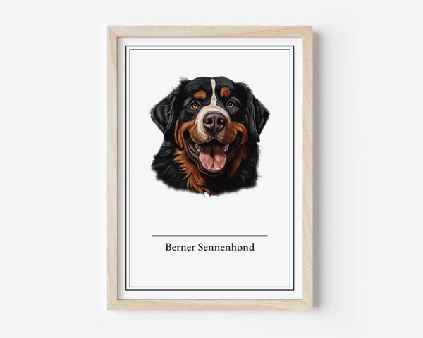 De Berner Sennenhond poster toont de majestueuze waakzaamheid van dit iconische ras, oorspronkelijk uit de Alpen. Een perfect beeld van kracht en trouw. Verkrijgbaar in A5, A4, 30x40 en A2 formaten, gedrukt op 350 grams premium papier. Voeg een lijst in zwart, wit of hout toe voor een stijlvolle afwerking.