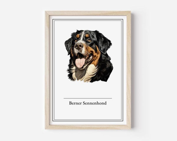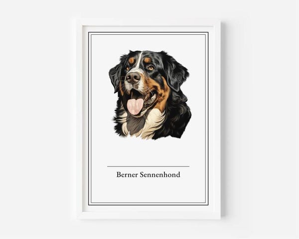 De Berner Sennenhond poster toont de majestueuze waakzaamheid van dit iconische ras, oorspronkelijk uit de Alpen. Een perfect beeld van kracht en trouw. Verkrijgbaar in A5, A4, 30x40 en A2 formaten, gedrukt op 350 grams premium papier. Voeg een lijst in zwart, wit of hout toe voor een stijlvolle afwerking.