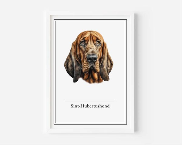 De Sint-Hubertushond poster vangt de indrukwekkende neuskracht van deze dierbare speurneus. Perfect voor een gezinsruimte, waar zijn nieuwsgierige blik altijd in de buurt is. Verkrijgbaar in A5, A4, 30x40 en A2 formaten, gedrukt op stevig 350 grams papier. Maak het compleet met een lijst in zwart, wit of hout voor een stijlvolle uitstraling!