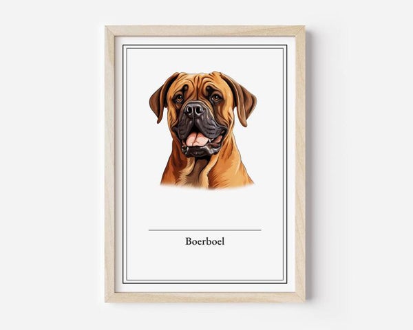 De Boerboel poster weerspiegelt de kracht en bescherming van dit imposante ras. Ideaal voor een zakelijke of woonruimte, waar zijn sterke aanwezigheid een statement maakt. Verkrijgbaar in A5, A4, 30x40 en A2 formaten, gedrukt op stevig 350 grams papier. Beschikbaar met lijstopties in zwart, wit of hout voor een verfijnde afwerking.
