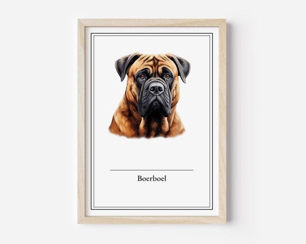De Boerboel poster weerspiegelt de kracht en bescherming van dit imposante ras. Ideaal voor een zakelijke of woonruimte, waar zijn sterke aanwezigheid een statement maakt. Verkrijgbaar in A5, A4, 30x40 en A2 formaten, gedrukt op stevig 350 grams papier. Beschikbaar met lijstopties in zwart, wit of hout voor een verfijnde afwerking.