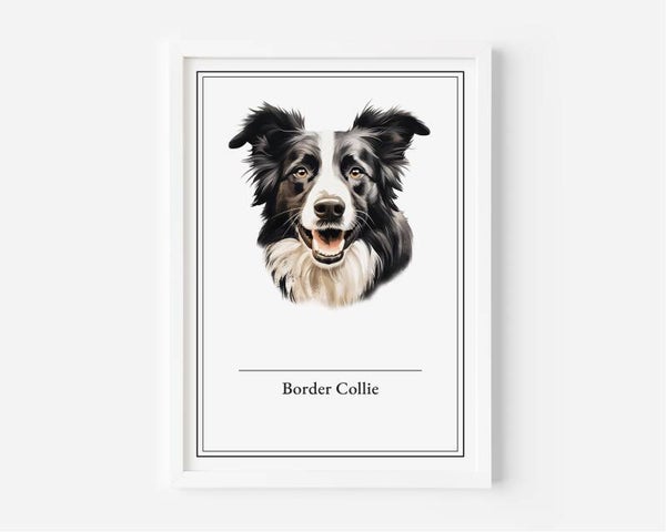 De Border Collie poster vangt de wijsheid en toewijding van dit slimme ras. Met zijn scherpe brein en onvermoeibare energie is deze hond de perfecte metgezel voor elke boerderij of gezin. Verkrijgbaar in A5, A4, 30x40 en A2 formaten, gedrukt op hoogwaardig 350 grams papier. Optioneel met een lijst in zwart, wit of hout voor een mooie afwerking.
