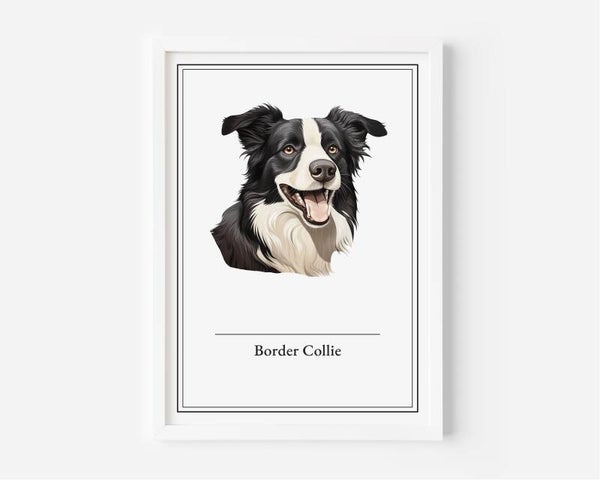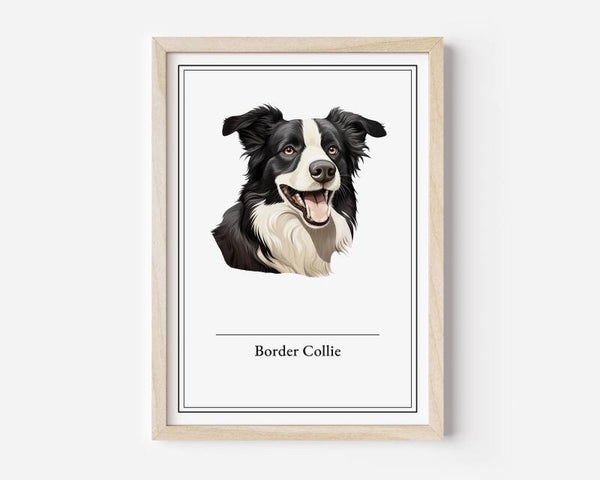 De Border Collie poster vangt de wijsheid en toewijding van dit slimme ras. Met zijn scherpe brein en onvermoeibare energie is deze hond de perfecte metgezel voor elke boerderij of gezin. Verkrijgbaar in A5, A4, 30x40 en A2 formaten, gedrukt op hoogwaardig 350 grams papier. Optioneel met een lijst in zwart, wit of hout voor een mooie afwerking.