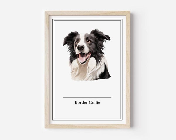 De Border Collie poster vangt de wijsheid en toewijding van dit slimme ras. Met zijn scherpe brein en onvermoeibare energie is deze hond de perfecte metgezel voor elke boerderij of gezin. Verkrijgbaar in A5, A4, 30x40 en A2 formaten, gedrukt op hoogwaardig 350 grams papier. Optioneel met een lijst in zwart, wit of hout voor een mooie afwerking.