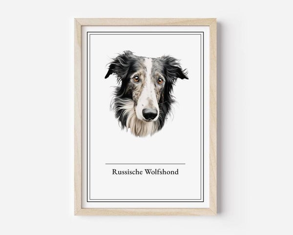 De Russische Wolfshond poster toont de gratie en elegantie van dit prachtige Russische ras. Met zijn lange, golvende vacht en statige uitstraling is deze hond een waar kunstwerk. Verkrijgbaar in A5, A4, 30x40 en A2 formaten, gedrukt op hoogwaardig 350 grams papier. Optioneel met een lijst in zwart, wit of hout voor een verfijnde afwerking.