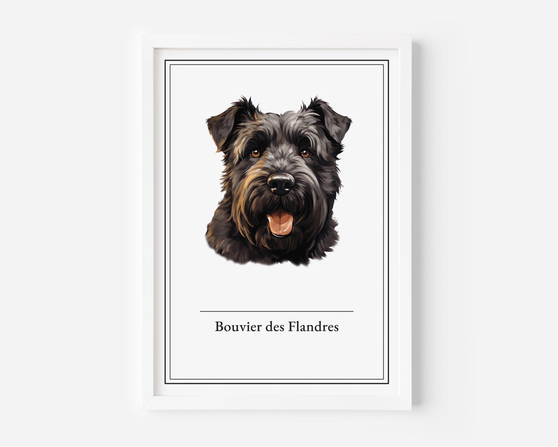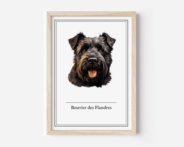 De Bouvier des Flandres poster straalt de kracht en loyaliteit uit van deze geweldige beschermer. Met zijn imposante uitstraling en trouwe karakter is deze hond een ware vriend en beschermer van het gezin. Verkrijgbaar in A5, A4, 30x40 en A2 formaten, op premium 350 grams papier.
