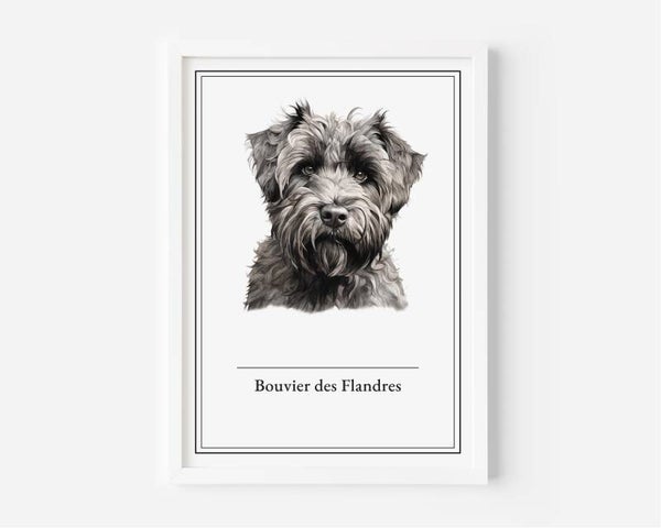 De Bouvier des Flandres poster straalt de kracht en loyaliteit uit van deze geweldige beschermer. Met zijn imposante uitstraling en trouwe karakter is deze hond een ware vriend en beschermer van het gezin. Verkrijgbaar in A5, A4, 30x40 en A2 formaten, op premium 350 grams papier.