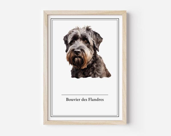 De Bouvier des Flandres poster straalt de kracht en loyaliteit uit van deze geweldige beschermer. Met zijn imposante uitstraling en trouwe karakter is deze hond een ware vriend en beschermer van het gezin. Verkrijgbaar in A5, A4, 30x40 en A2 formaten, op premium 350 grams papier.
