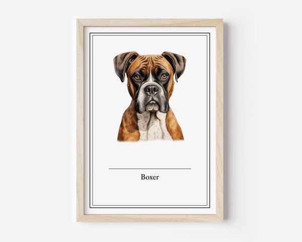 De Boxer poster brengt de speelse energie en loyaliteit van dit geweldige ras tot leven. Deze levendige hond is altijd klaar voor actie en brengt vreugde in elk huis. Verkrijgbaar in A5, A4, 30x40 en A2 formaten, op stevig 350 grams papier.