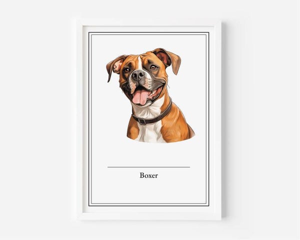 De Boxer poster brengt de speelse energie en loyaliteit van dit geweldige ras tot leven. Deze levendige hond is altijd klaar voor actie en brengt vreugde in elk huis. Verkrijgbaar in A5, A4, 30x40 en A2 formaten, op stevig 350 grams papier.