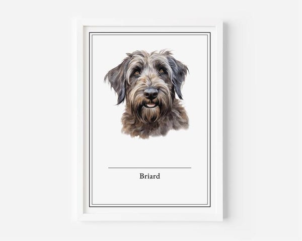 De Briard poster weerspiegelt de kracht en intelligentie van dit indrukwekkende ras. Deze beschermende waakhond staat bekend om zijn toewijding en majestueuze uitstraling. Verkrijgbaar in A5, A4, 30x40 en A2 formaten, gedrukt op 350 grams premium papier.