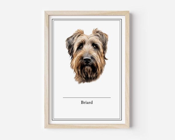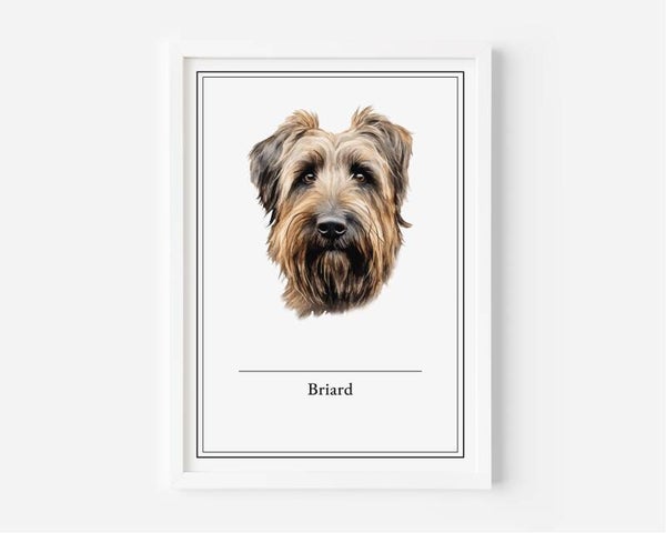 De Briard poster weerspiegelt de kracht en intelligentie van dit indrukwekkende ras. Deze beschermende waakhond staat bekend om zijn toewijding en majestueuze uitstraling. Verkrijgbaar in A5, A4, 30x40 en A2 formaten, gedrukt op 350 grams premium papier.