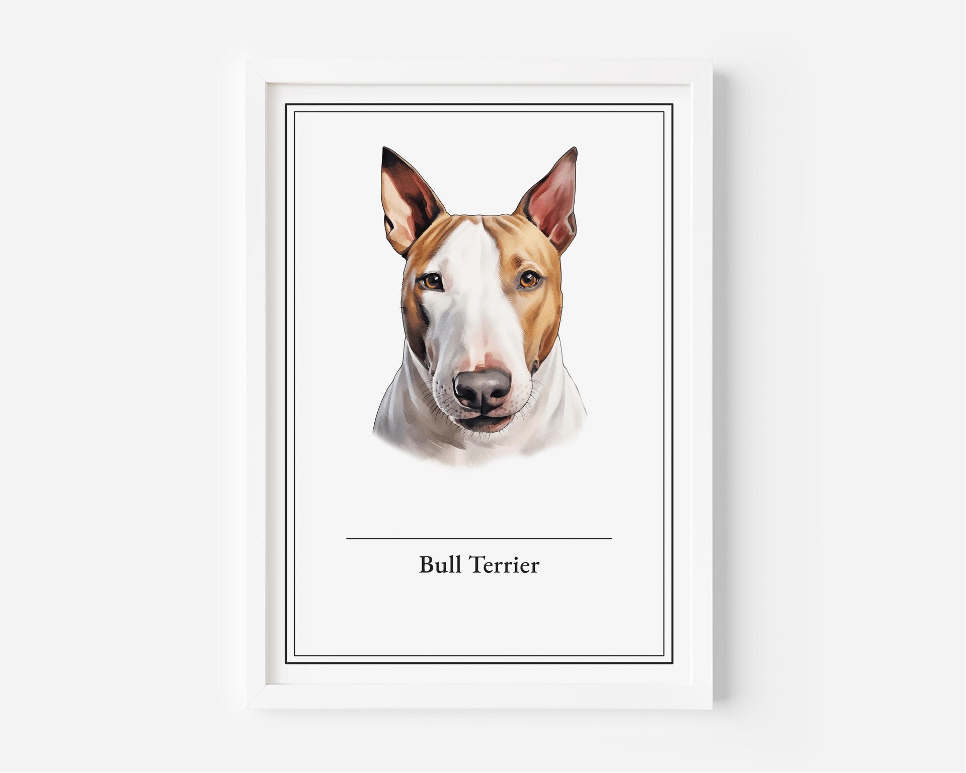 De Bull Terrier poster belichaamt de stoere en unieke uitstraling van dit iconische ras. Met zijn gedurfde karakter en krachtige voorkomen is hij een echte blikvanger in elk huis. Verkrijgbaar in A5, A4, 30x40 en A2 formaten, gedrukt op stevig 350 grams papier.