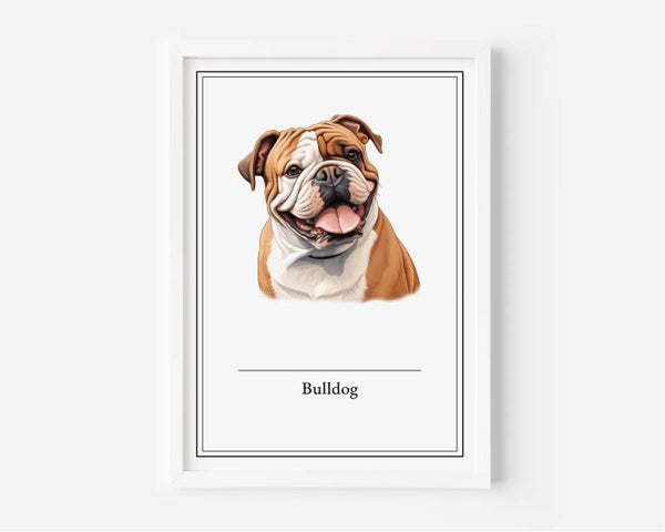 De Bulldog poster straalt kracht, karakter en charme uit. Dit iconische ras, met zijn stoere uitstraling en unieke persoonlijkheid, brengt een sterke indruk in elk huis. Verkrijgbaar in A5, A4, 30x40 en A2 formaten, gedrukt op stevig 350 grams papier.