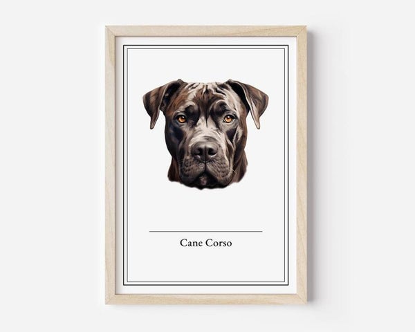 De Cane Corso poster benadrukt de robuuste kracht en waakzaamheid van dit indrukwekkende Italiaanse ras. Perfect voor een zakelijke uitstraling in elk kantoor of werkruimte. Verkrijgbaar in A5, A4, 30x40 en A2 formaten, gedrukt op stevig 350 grams papier.