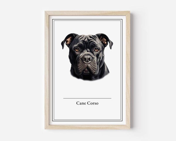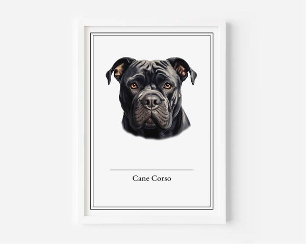 De Cane Corso poster benadrukt de robuuste kracht en waakzaamheid van dit indrukwekkende Italiaanse ras. Perfect voor een zakelijke uitstraling in elk kantoor of werkruimte. Verkrijgbaar in A5, A4, 30x40 en A2 formaten, gedrukt op stevig 350 grams papier.