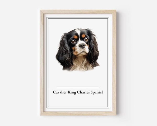 De Cavalier King Charles Spaniel poster straalt een zachte charme uit met zijn elegante verschijning. Een perfect stuk om je huis te verfraaien, vol liefde en rust. Verkrijgbaar in A5, A4, 30x40 en A2 formaten, gedrukt op 350 grams papier voor een luxe afwerking.