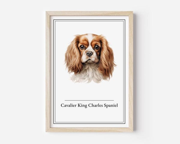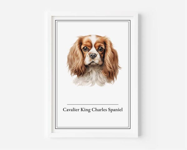 De Cavalier King Charles Spaniel poster straalt een zachte charme uit met zijn elegante verschijning. Een perfect stuk om je huis te verfraaien, vol liefde en rust. Verkrijgbaar in A5, A4, 30x40 en A2 formaten, gedrukt op 350 grams papier voor een luxe afwerking.