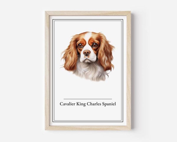 De Cavalier King Charles Spaniel poster straalt een zachte charme uit met zijn elegante verschijning. Een perfect stuk om je huis te verfraaien, vol liefde en rust. Verkrijgbaar in A5, A4, 30x40 en A2 formaten, gedrukt op 350 grams papier voor een luxe afwerking.