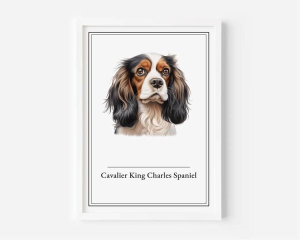 De Cavalier King Charles Spaniel poster straalt een zachte charme uit met zijn elegante verschijning. Een perfect stuk om je huis te verfraaien, vol liefde en rust. Verkrijgbaar in A5, A4, 30x40 en A2 formaten, gedrukt op 350 grams papier voor een luxe afwerking.