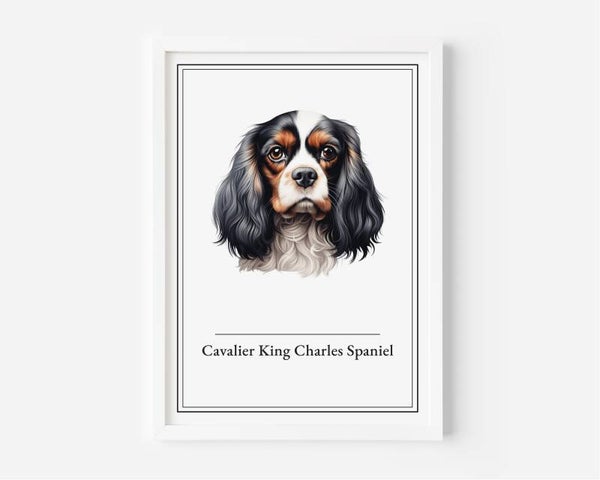 De Cavalier King Charles Spaniel poster straalt een zachte charme uit met zijn elegante verschijning. Een perfect stuk om je huis te verfraaien, vol liefde en rust. Verkrijgbaar in A5, A4, 30x40 en A2 formaten, gedrukt op 350 grams papier voor een luxe afwerking.