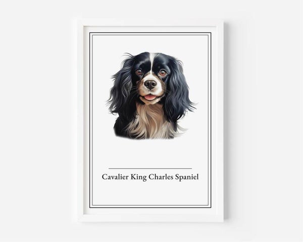 De Cavalier King Charles Spaniel poster straalt een zachte charme uit met zijn elegante verschijning. Een perfect stuk om je huis te verfraaien, vol liefde en rust. Verkrijgbaar in A5, A4, 30x40 en A2 formaten, gedrukt op 350 grams papier voor een luxe afwerking.
