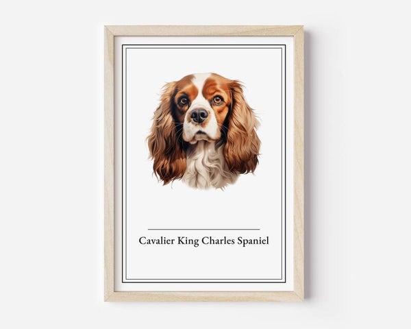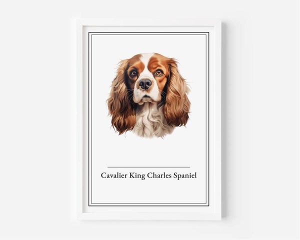 De Cavalier King Charles Spaniel poster straalt een zachte charme uit met zijn elegante verschijning. Een perfect stuk om je huis te verfraaien, vol liefde en rust. Verkrijgbaar in A5, A4, 30x40 en A2 formaten, gedrukt op 350 grams papier voor een luxe afwerking.
