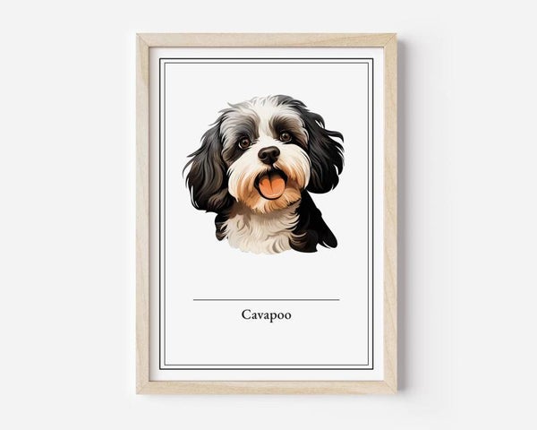 De Cavapoo poster vangt de speelse en liefdevolle uitstraling van dit schattige ras. Perfect voor een warme, huiselijke sfeer. Verkrijgbaar in A5, A4, 30x40 en A2 formaten, gedrukt op 350 grams papier voor een mooie, duurzame afdruk.