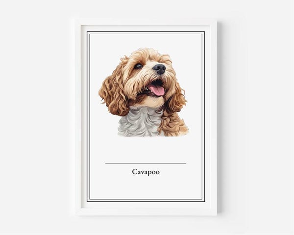 De Cavapoo poster vangt de speelse en liefdevolle uitstraling van dit schattige ras. Perfect voor een warme, huiselijke sfeer. Verkrijgbaar in A5, A4, 30x40 en A2 formaten, gedrukt op 350 grams papier voor een mooie, duurzame afdruk.