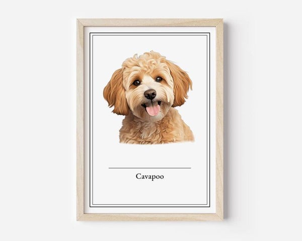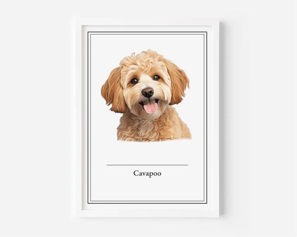 De Cavapoo poster vangt de speelse en liefdevolle uitstraling van dit schattige ras. Perfect voor een warme, huiselijke sfeer. Verkrijgbaar in A5, A4, 30x40 en A2 formaten, gedrukt op 350 grams papier voor een mooie, duurzame afdruk.