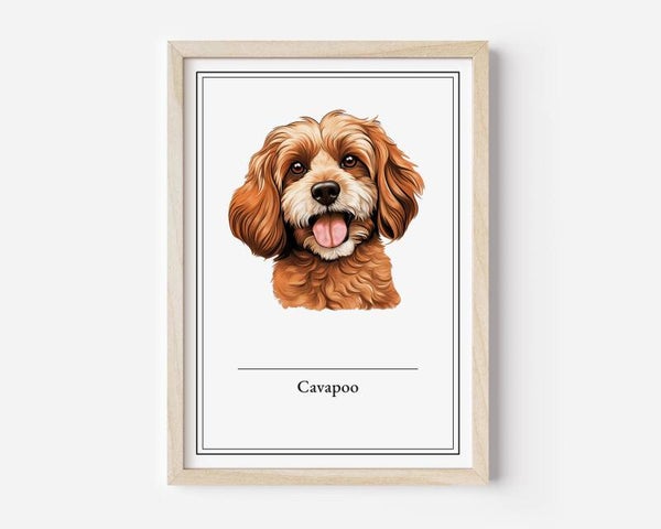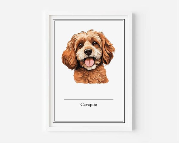 De Cavapoo poster vangt de speelse en liefdevolle uitstraling van dit schattige ras. Perfect voor een warme, huiselijke sfeer. Verkrijgbaar in A5, A4, 30x40 en A2 formaten, gedrukt op 350 grams papier voor een mooie, duurzame afdruk.