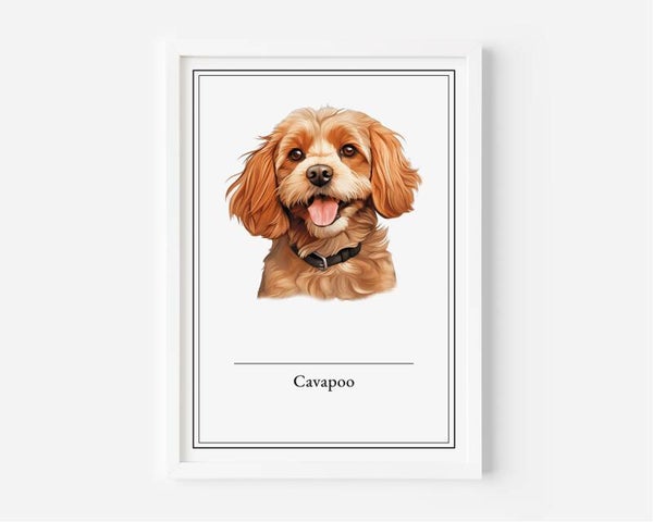 De Cavapoo poster vangt de speelse en liefdevolle uitstraling van dit schattige ras. Perfect voor een warme, huiselijke sfeer. Verkrijgbaar in A5, A4, 30x40 en A2 formaten, gedrukt op 350 grams papier voor een mooie, duurzame afdruk.