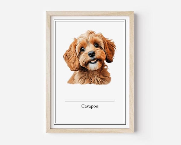 De Cavapoo poster vangt de speelse en liefdevolle uitstraling van dit schattige ras. Perfect voor een warme, huiselijke sfeer. Verkrijgbaar in A5, A4, 30x40 en A2 formaten, gedrukt op 350 grams papier voor een mooie, duurzame afdruk.