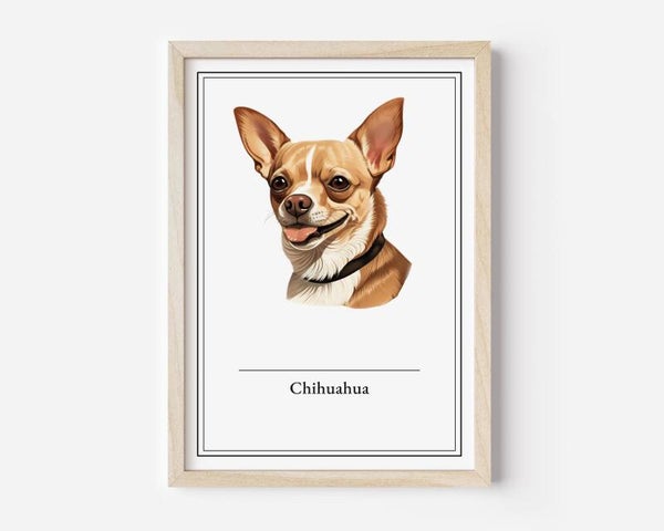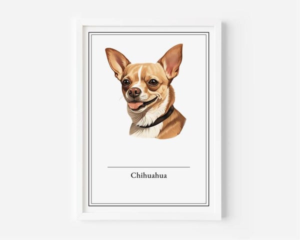 De Chihuahua poster toont het onmiskenbare karakter van dit kleine, maar krachtige ras. Klein van formaat, maar groot in persoonlijkheid, maakt deze poster een charmante toevoeging aan elke ruimte. Verkrijgbaar in A5, A4, 30x40 en A2 formaten op 350 grams papier.