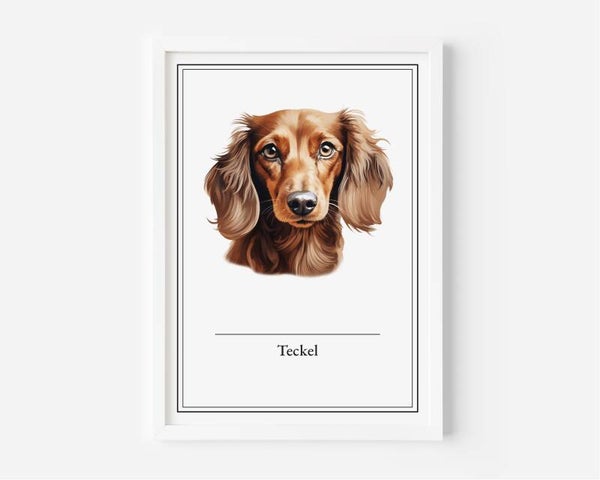 Deze Teckel poster voegt een speelse charme toe aan je huis. De korte pootjes en het grote karakter van de hond zijn perfect vastgelegd in A5, A4, 30x40 en A2 formaten. Geprint op hoogwaardig 350 grams papier.