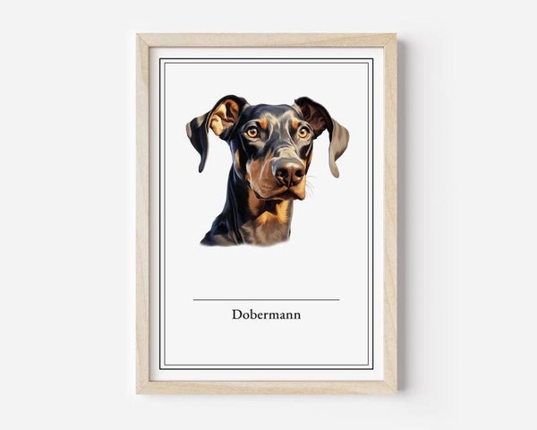 De Dobermann is de ultieme waakhond, altijd alert en betrouwbaar. Deze poster legt zijn onvermoeibare waakzaamheid vast, perfect voor elke ruimte. Verkrijgbaar in A5, A4, 30x40 en A2 formaten op 350 grams papier, ideaal voor een stevige, lange levensduur.