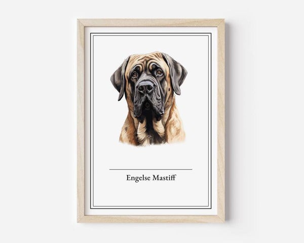 De Engelse Mastiff, een imposante, maar zachte reus, straalt een serene kracht uit. Deze verfijnde poster vangt zijn majestueuze aanwezigheid en rustige wijsheid. Beschikbaar in A5, A4, 30x40 en A2 formaten op hoogwaardig 350 grams papier.