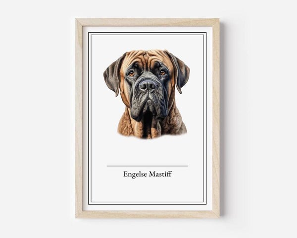 De Engelse Mastiff, een imposante, maar zachte reus, straalt een serene kracht uit. Deze verfijnde poster vangt zijn majestueuze aanwezigheid en rustige wijsheid. Beschikbaar in A5, A4, 30x40 en A2 formaten op hoogwaardig 350 grams papier.