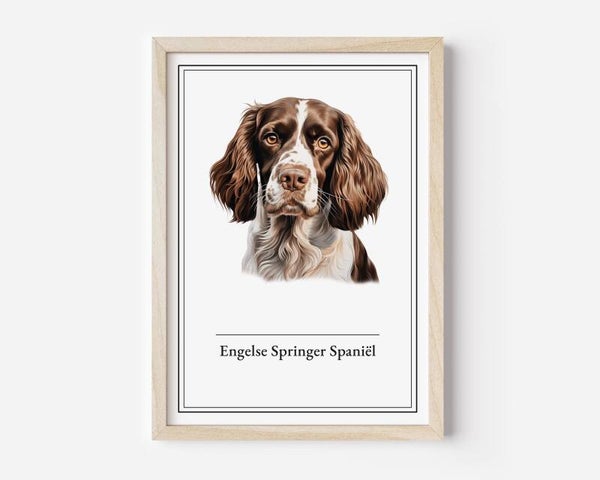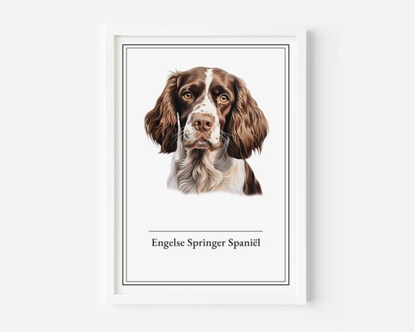 De Engelse Springer Spaniël, een vrolijke en energieke metgezel, barst van levenslust en trouw. Deze levendige poster vangt zijn speelse charme en alerte blik. Beschikbaar in A5, A4, 30x40 en A2 formaten op hoogwaardig 350 grams papier.