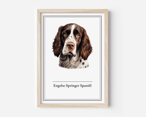 De Engelse Springer Spaniël, een vrolijke en energieke metgezel, barst van levenslust en trouw. Deze levendige poster vangt zijn speelse charme en alerte blik. Beschikbaar in A5, A4, 30x40 en A2 formaten op hoogwaardig 350 grams papier.