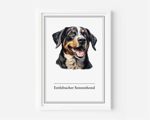 De Entlebucher Sennenhond, met zijn krachtige stamina en scherpe intelligentie, is een toegewijde metgezel. Deze poster legt de essentie van deze energieke Zwitserse herder vast. Verkrijgbaar in A5, A4, 30x40 en A2 formaten op stevig 350 grams papier.